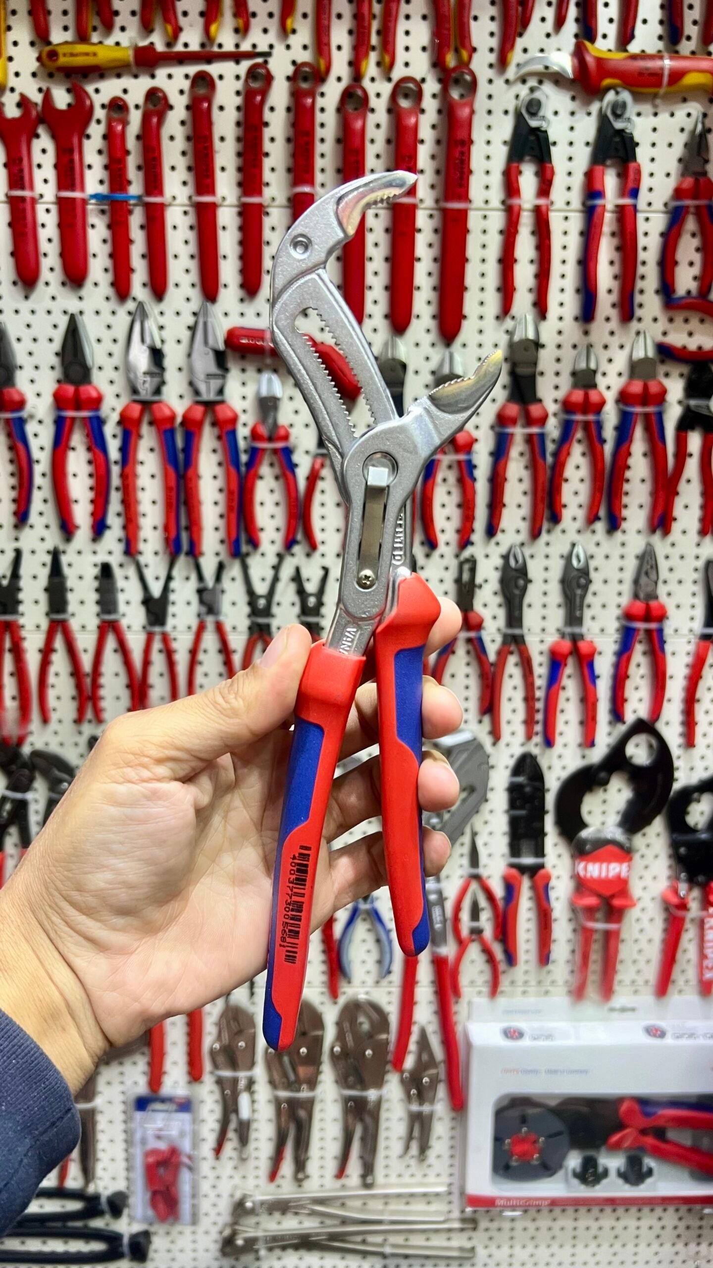 For pipes, nuts, sleeves, for various kinds of components: the professional user applies the Knipex Cobra quickly and accurately with just one hand movement. The spring-loaded hinge bolt locks securely into place without adjusting inadvertently. Thanks to the 25-fold fine adjustment, the Knipex Cobra can be ideally adjusted to different sizes of component. This fine adjustment also ensures that the distance to the handles remains hand-friendly for every opening width.