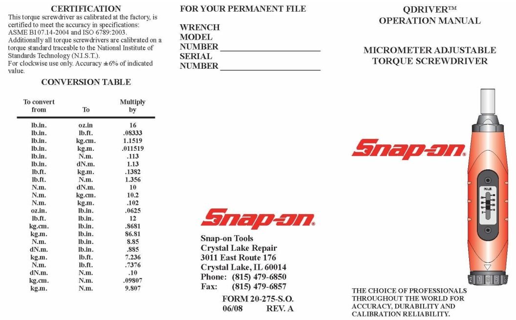 Snap-on Repair Center, 1 YEAR from Date of Purchase, Repair or Calibrate at Snap-on Repair Center.