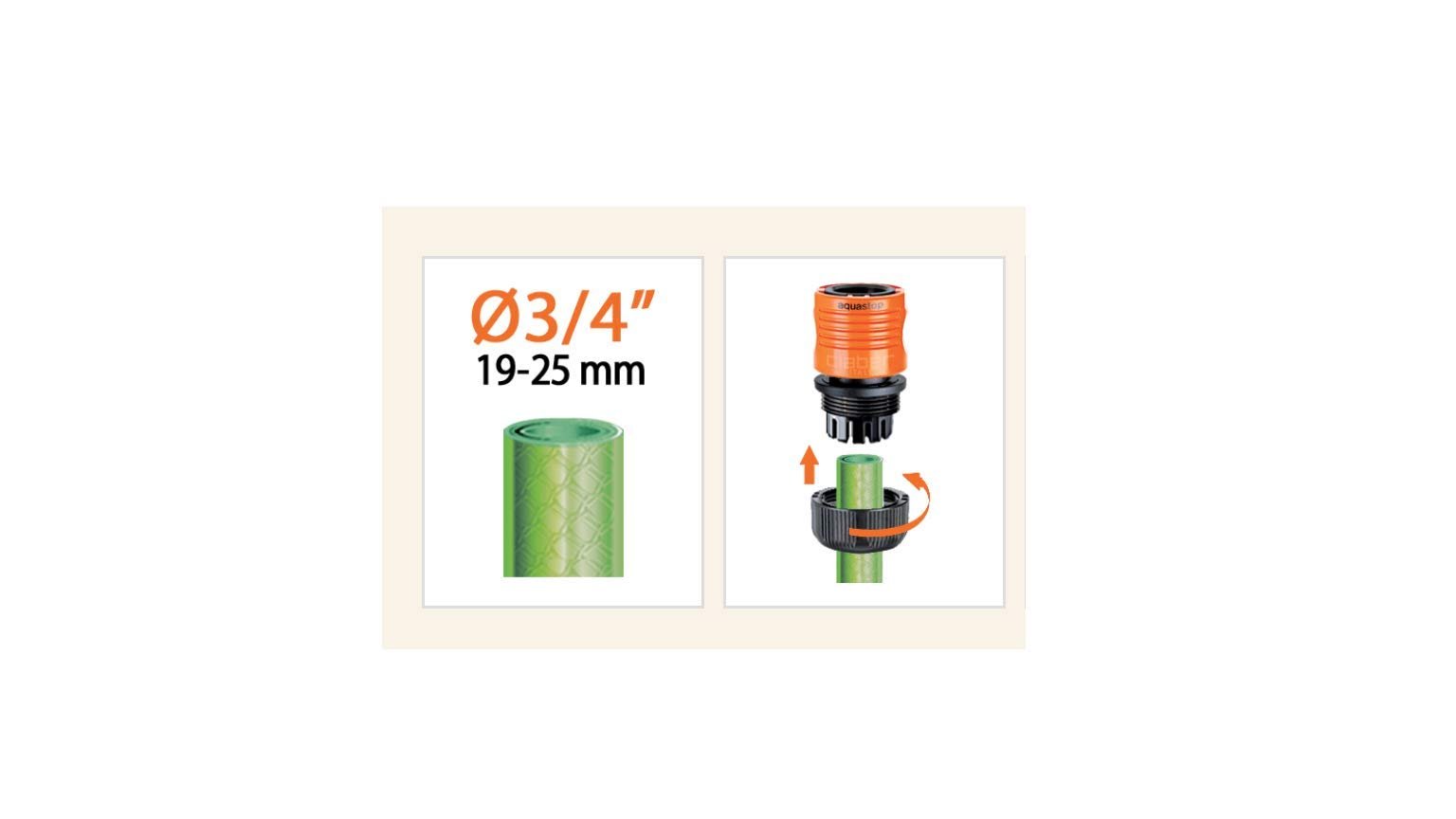 Automatic coupling for 3/4” (Ø 19 mm) hoses with aquastop valve. Inserted at the end of the hose, water flow is interrupted by disconnection of male piece.