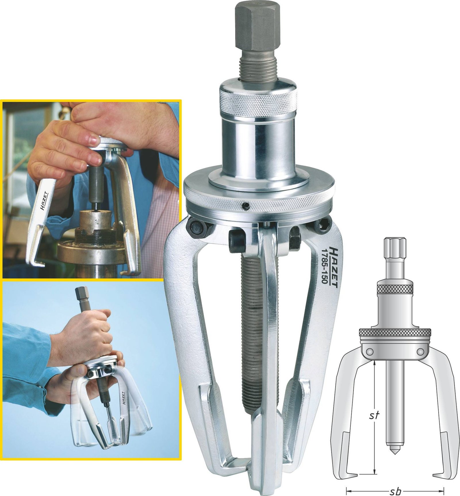 Number of puller hooks [Units] 3 Max. tonne 6.5 t Clamping range round max. 250 mm Clamping depth (mm) 250 Spindle G 1⁄2″ x 350 mm Hazet puller 1785-250