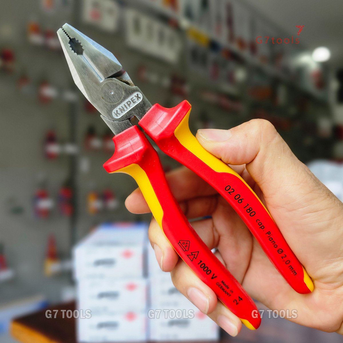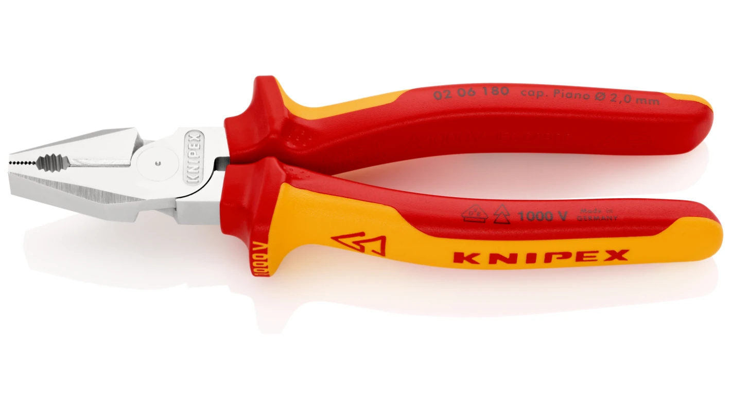 The fabrication of the 02 06 180 high leverage combination pliers is designed for tough use in industry and trade. Forged from special tool steel, they receive an additional, multi-stage oil hardening. The final chrome plating protects against corrosion. Its ergonomic shape enables a secure and powerful grip. The insulating multi-component grips on the handles are VDE-tested.