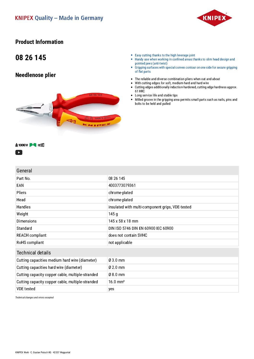 Pulling a nail out of the wall or holding a nail to drive it in, cutting wire, pulling out the locking pin on a door handle, tightening the Bowden cable on a bike – there are several occasions when the needle nose combination pliers from Knipex prove to be a useful everyday helper. They are ideal for working in inaccessible places due to the slim head design. Small components such as pins, bolts and nails are held securely and safely in the milled groove in the handle area. Knipex has developed the 08 26 145 to be reliable, versatile needle nose combination pliers for use when out and about, but which of course perform just as well in the workshop and for electrical installation work.