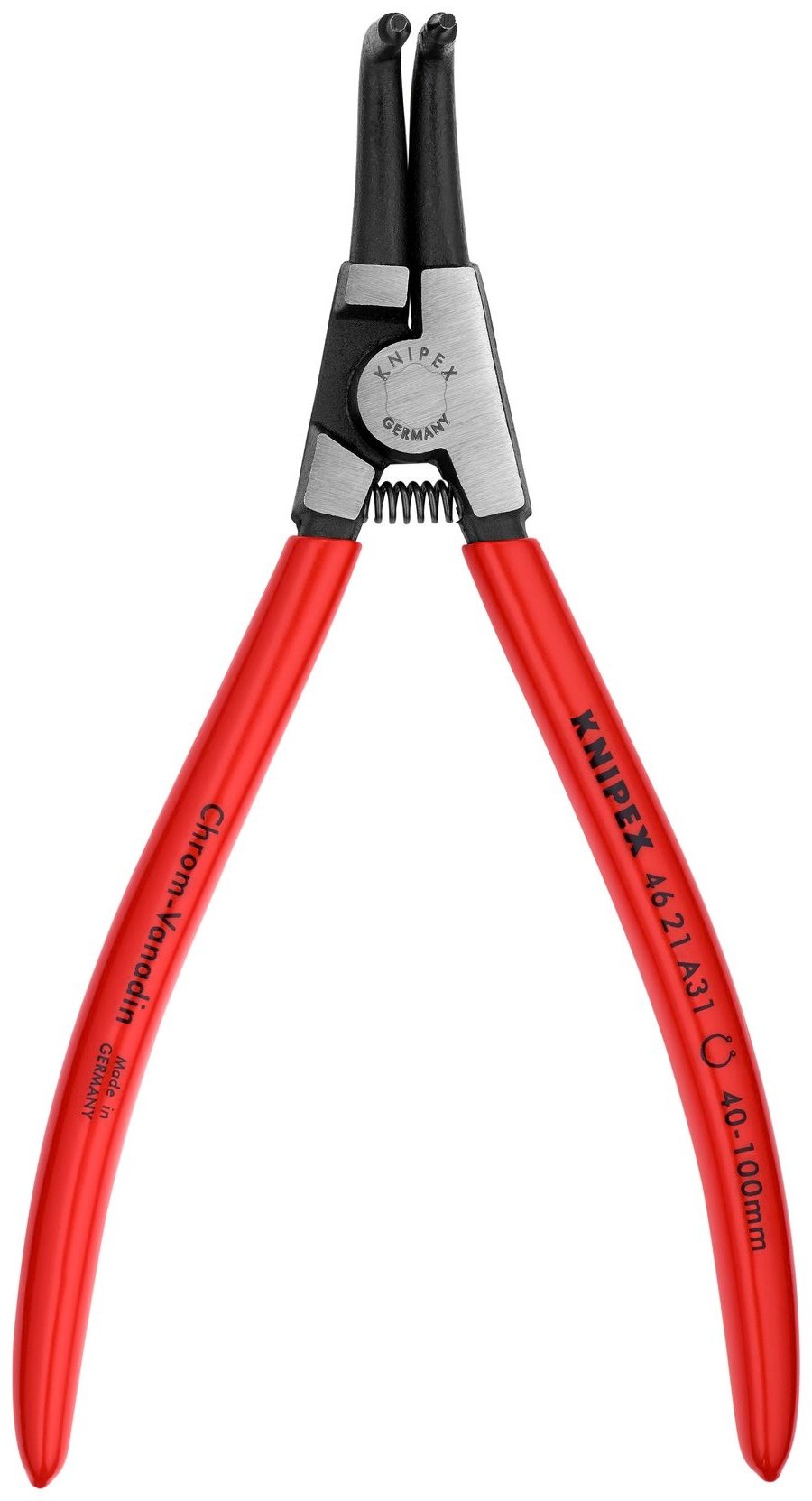 The Knipex 46 21 A31 circlip pliers are a reliable, professional tool. It increases the safety of machines and other technical devices on which circlips are used. Thanks to the 90° angle of the pliers head, circlips can be reached with ease when a part is in the way so that vertical access is impossible.