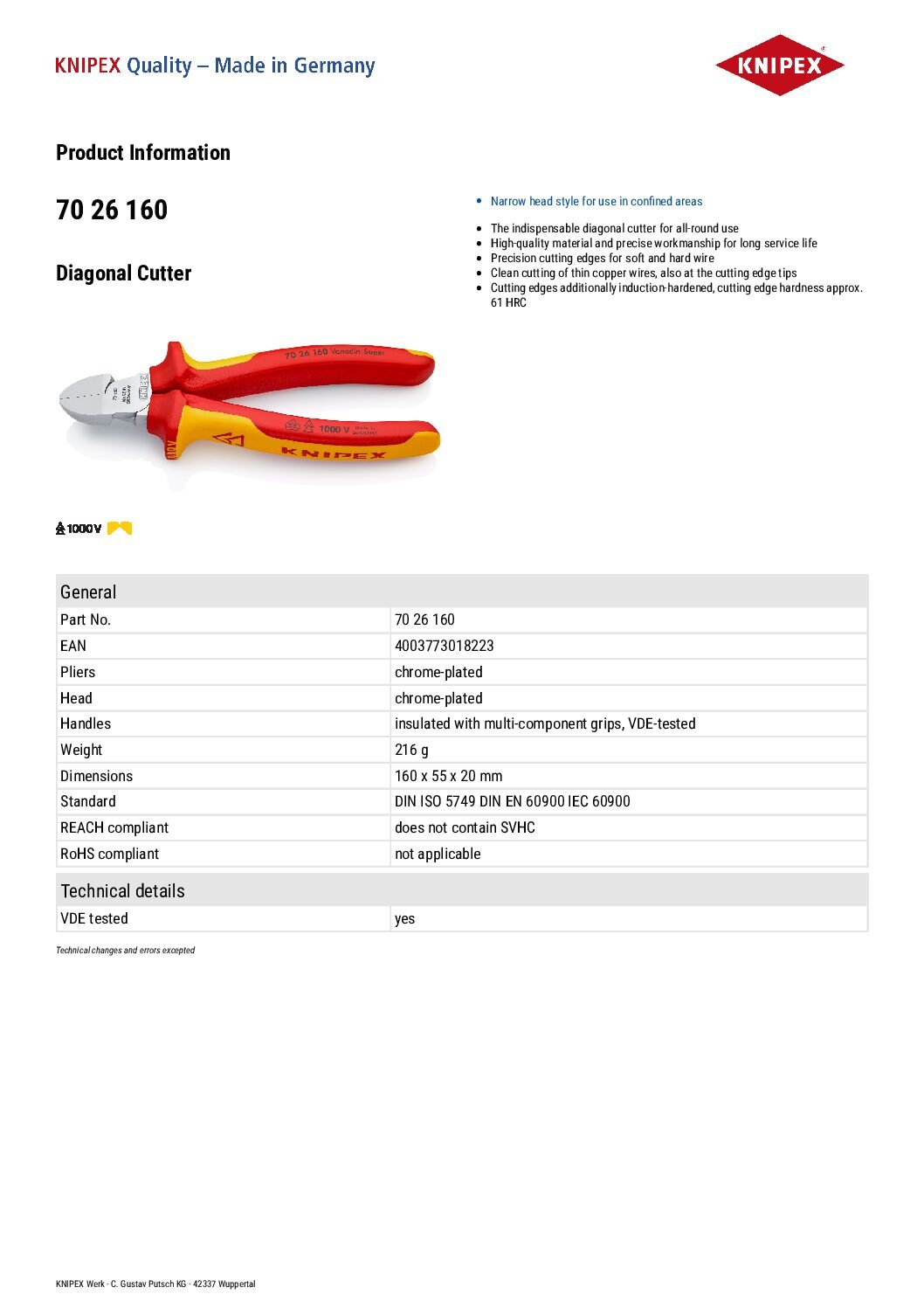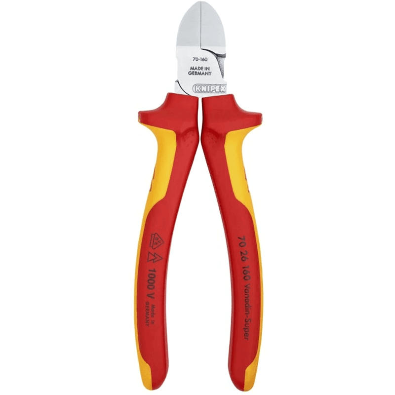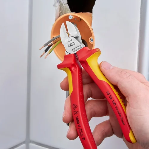 The Knipex 70 26 160 diagonal cutters are insulated using multi-component grips in accordance with the insulation standard IEC 60900 / DIN EN 60900.