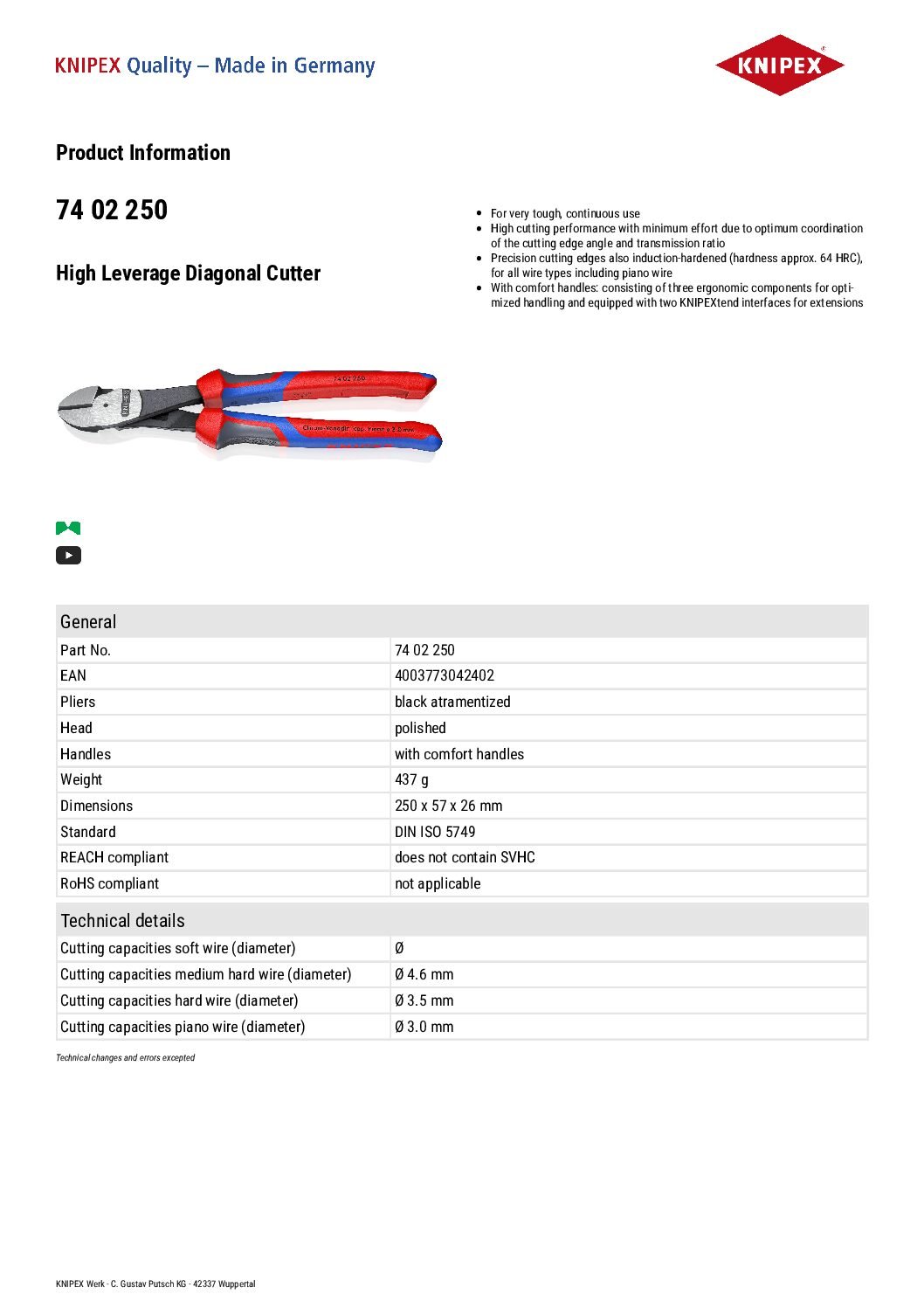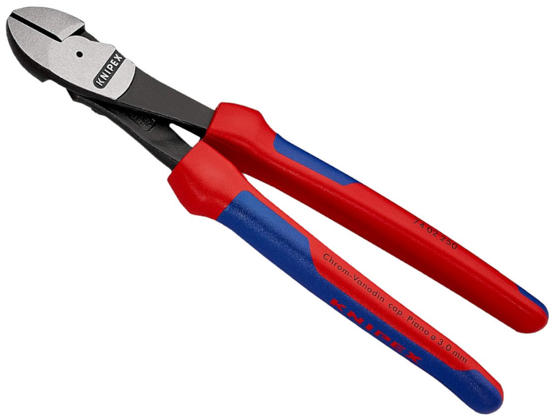 Thanks to their high cutting capacity and indestructible strength, the Knipex 74 02 250 high leverage diagonal cutters are highly valued especially by craftsmen. They are also often used in the 250 mm long version on the building site and in manufacturing because they can be used to cut hard materials such as piano wire up to 3.0 Ø mm effortlessly.