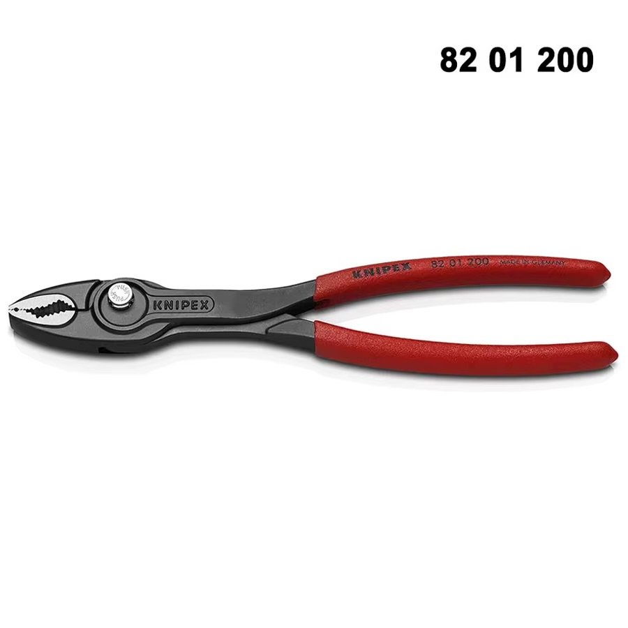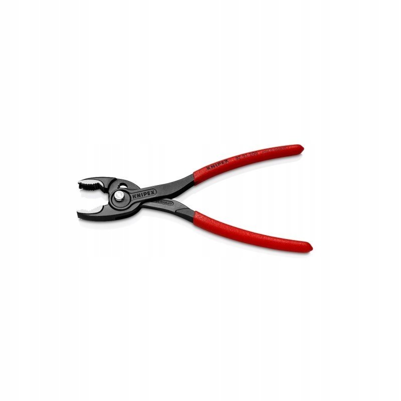 The unique two-in-one function of the KNIPEX TwinGrip Slip Joint Pliers allows extremely efficient front and side gripping! This makes it an indispensable aid for holding and loosening stuck workpieces in all positions – even bolts and screws with worn profiles. The TwinGrip features an ingenious design and smart details: Thanks to the elongated shape and narrow turning zone, screws can be loosened and tightened quickly and easily even in confined spaces. The five-way adjustable, sliding box-joint enables precise adjustment of the gripping capacity with a simple push-button adjustment. A high-grip front gripping jaw with robust teeth and a high gear ratio at the tip of the jaw grips workpieces with large diameters of 4-22 mm. Non-slip plastic handles, applied using a dipping process (to protect the hands from contact with bare steel and for better transfer of hand force) and a pinch guard complete the TwinGrip 82 01 200.
