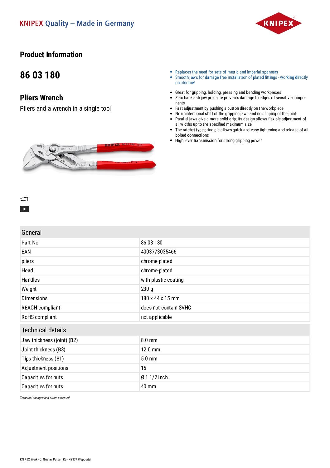 The wrench combines many functions: It replaces metric as imperial a whole set of spanners, can be adjusted very quickly and directly at the workpiece at the touch of a button and continuously packs all gripping widths up to 40 mm or 1 1/2 inch. The joint bolt locks securely in place, which prevents accidental adjustment. The smooth gripping jaws stand in parallel and pack the work piece without damaging edges and sensitive surfaces – work directly on chrome.