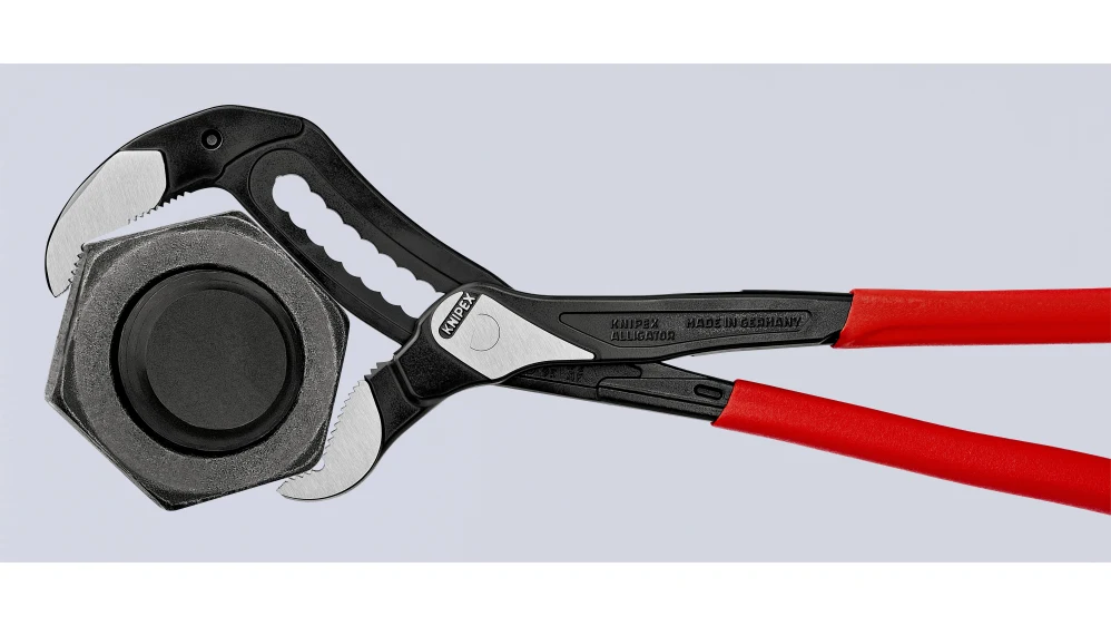 Plumbing and heating work is often performed in confined spaces. The arched adjustment slot and slim head shape of the Knipex Alligator are an advantage here. As compact as these pliers are, the possible grip widths are surprisingly large due to the 11-step locking adjustment: pipes up to 90 mm in diameter (3 ½ inches) and nuts up to 95 mm wrench opening.
