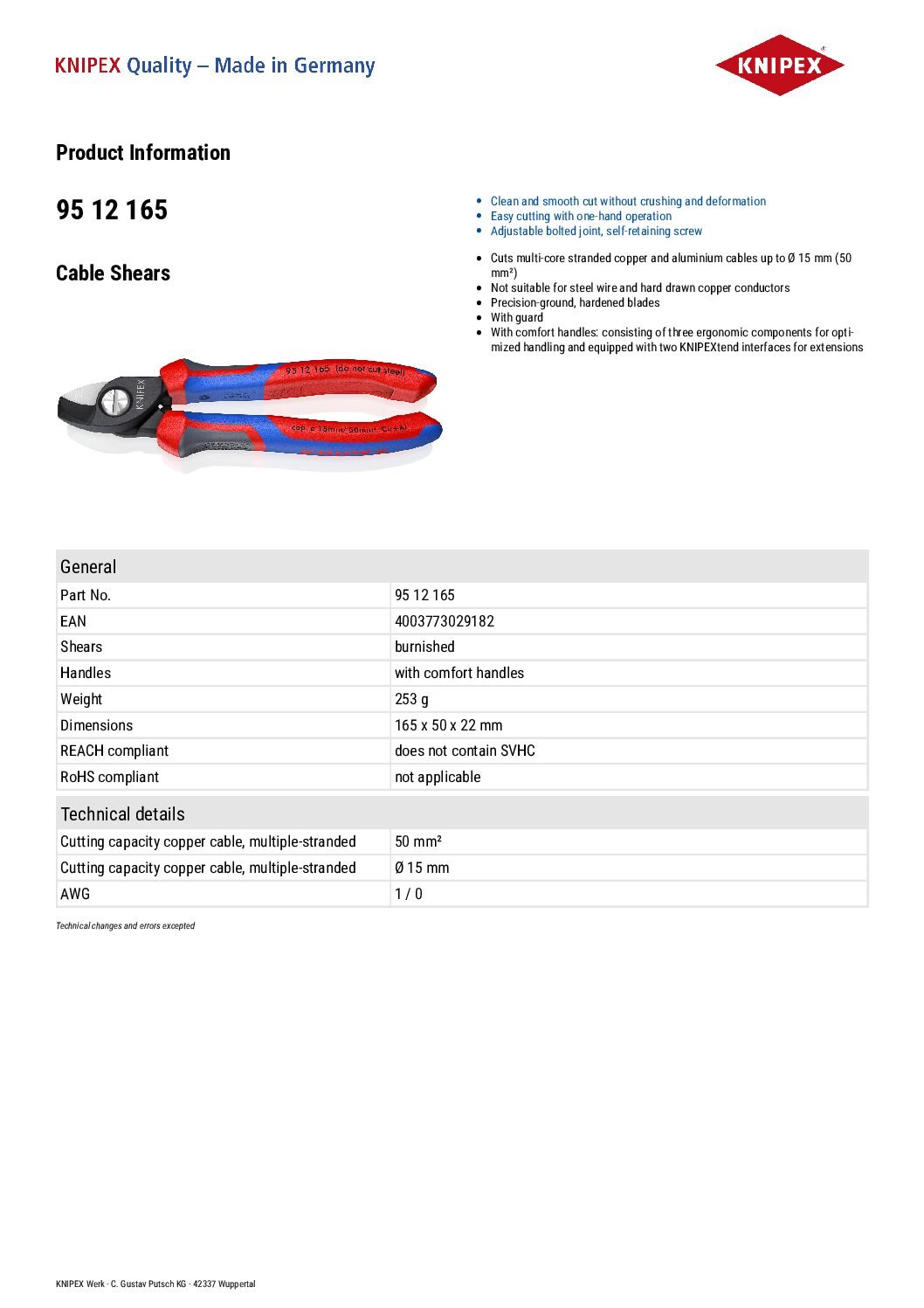 - Cuts multi-core stranded copper and aluminium cables up to Ø 15 mm (50 mm²)