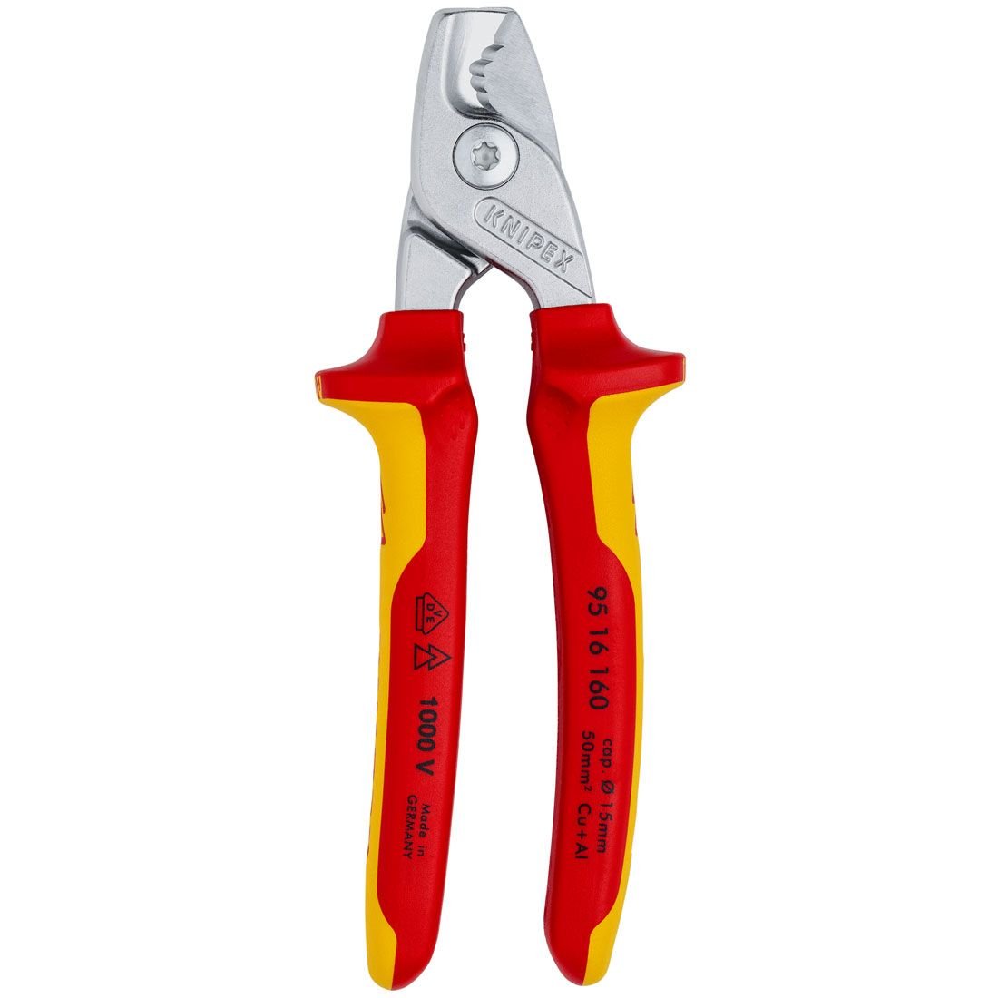 This is made possible by inductively hardened blades, with a milled serrated edge on the front and a flat edge on the back. Further plus points: The KNIPEX StepCut cuts surprisingly smoothly, mostly without crushing the cables; the pinch guard prevents injury; the bolted joint enables the cable cutter to work precisely and smoothly.