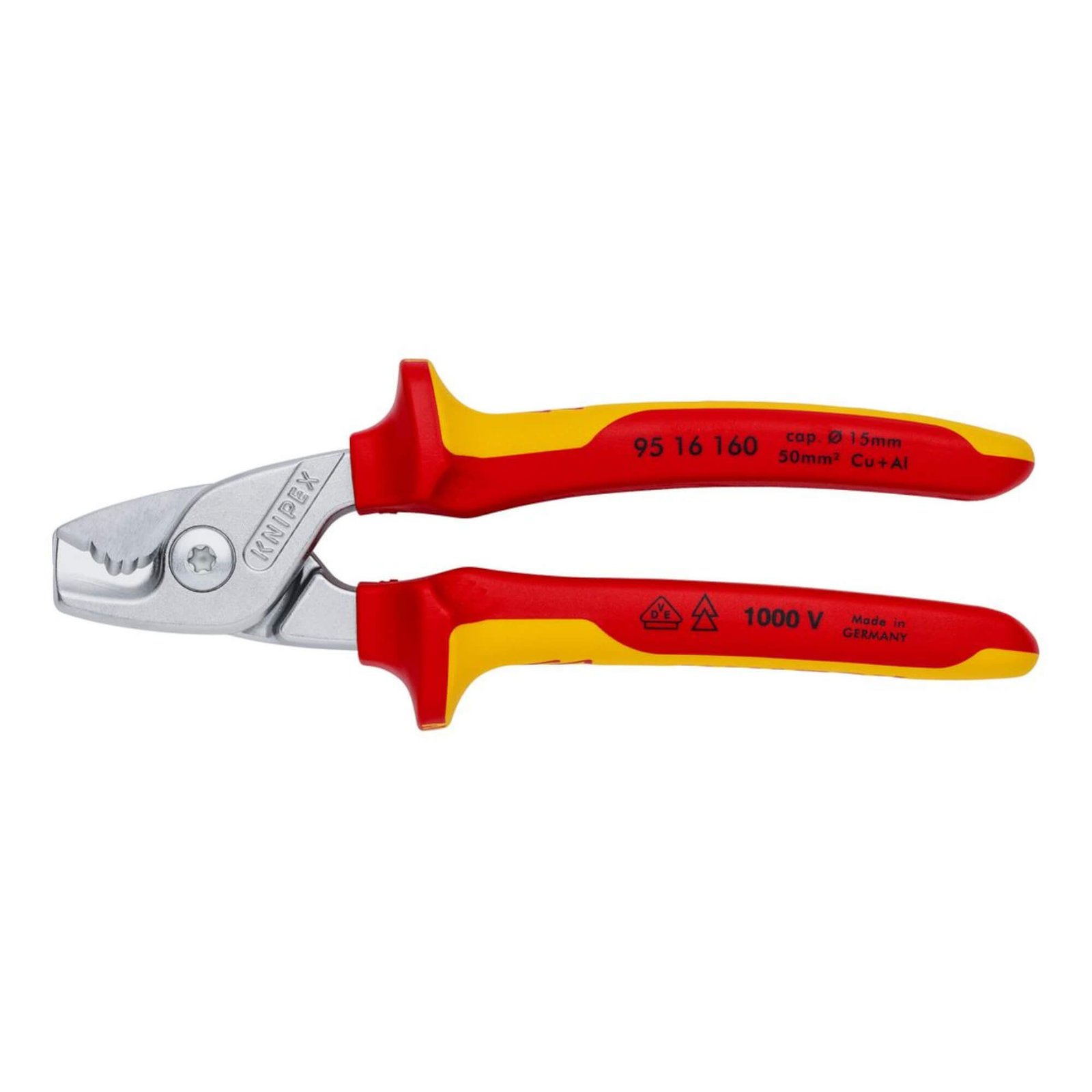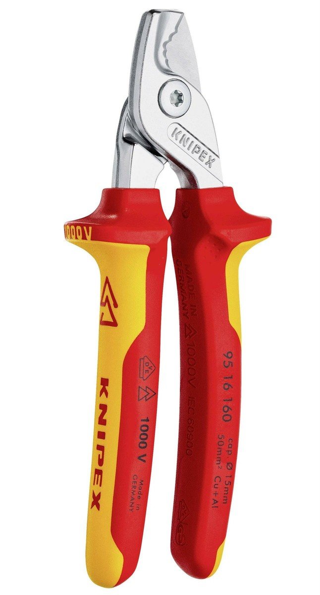Good news for all electrical professionals: The KNIPEX StepCut 95 11 160 cuts multi-core cables substantially more easily than cable cutters of a comparable length. It cuts wires and strands one after the other, reducing the effort required by up to 40 percent. This gives the cable shears, which are only 16 centimetres long, a surprisingly high capacity: They easily and precisely cut single and multi-conductor copper and aluminium cables up to a diameter of 15 millimetres (50 mm²) and solid NYM cables up to a maximum of 5 x 4 mm².
