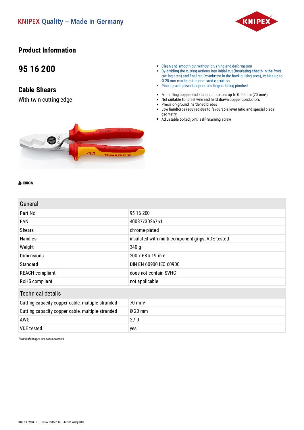 Unlike diagonal cutters with blades that meet at an obtuse angle, and which crush cable insulation and deform cable ends, the Knipex 95 16 200 cable shears cut with the twin cutting edge using a scissors action. This principle produces a substantially better result, because the cable is not crushed, but is cut very smoothly and cleanly. They are therefore excellent for shortening stranded and finely stranded Cu and Al cables, also with large cross-sections. For reasons of design, the cable shears must not be used to cut steel wire or hard drawn copper conductors.