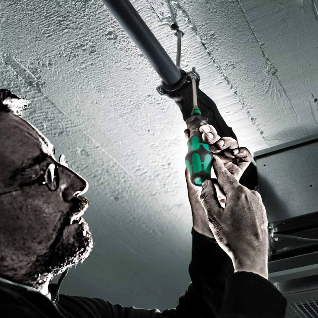 Many users would like to be able to carry out screwdriving processes faster without compromise. With a screwdriver that is precise, allows powerful screwdriving, and is much faster than a conventional screwdriver. A part-time universal gear is the solution: Integrated in the screwdriver handle, it quadruples the working speed with smooth couplings – purely mechanically. One hand holds the front part of the handle, the other hand turns the rear part of the handle. The turbo function can be switched on or off at the push of a button. Turning it off is recommended for tightening and loosening with high torque, e.g. for screw connections in wood, as well as for fine adjustments. Robust, maintenance-free gear made of steel with a maximum torque of 14Nm when the turbo function is deactivated. Thanks to the Rapidaptor bit holder, the Kraftform Turbo can be used with all conventional 1/4″ hexagon bits for a wide variety of screw profiles. With the Rapidaptor function the bits can be inserted directly and can be easily removed by pushing the sleeve forward.